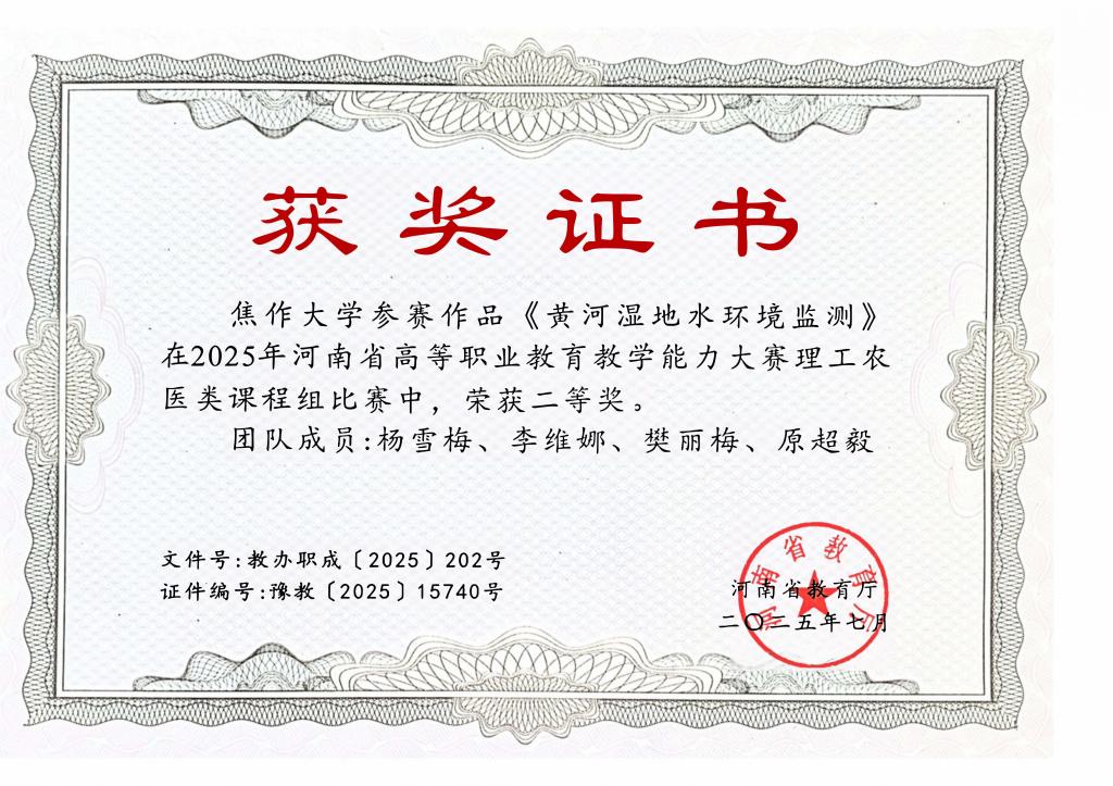 近日,河南省高等职业教育教学能力大赛评选结果揭晓,sunbet游戏官网杨雪梅员工团队凭借《黄河湿地水环境监测》参赛作品,脱颖而出斩获二等奖,充分彰显了sunbet游戏官网员工扎实的教学功底与创新的教学改革成果。